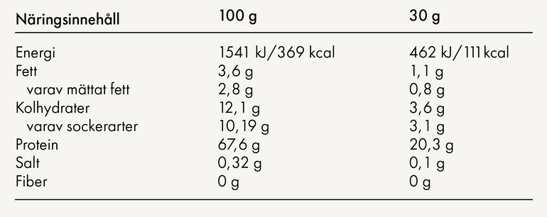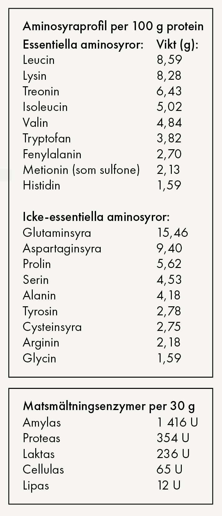 Matsmältningsenzymer deltar i nedbrytningen av protein och laktos. Tillverkat av ultrafiltrerat vassleproteinkoncentrat från mjölk från gräsbetande kor i Norden.
